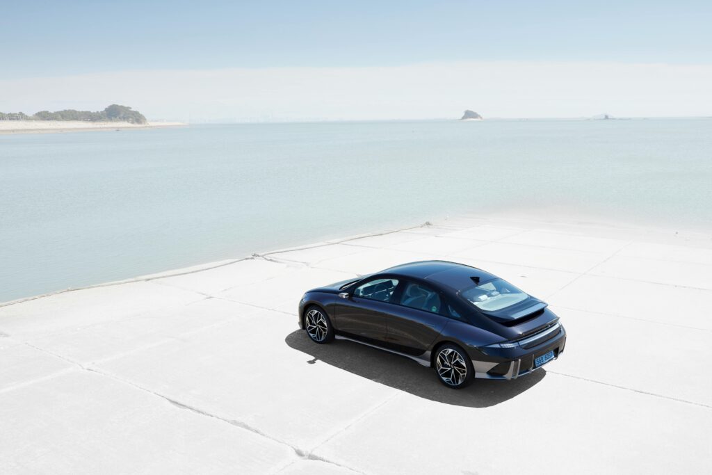 This Hyundai Ioniq 6 has a smooth, sleek shape that helps air flow. This not only helps the car go farther, but it also makes it cheaper to run. It looks good because it is slim, quick, and stylish, and its body is bent.